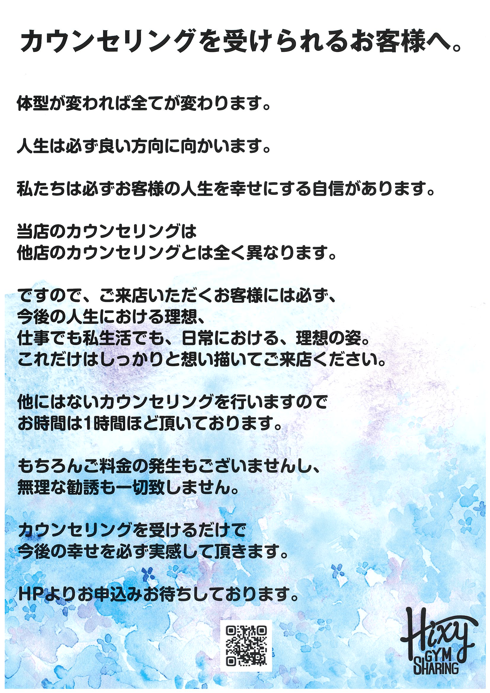 HIXY gym sharingのカウンセリングは他店のカウンセリングとは全く異なります。
